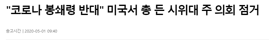 "코로나 봉쇄령 반대" 미국서 총 든 시위대 주 의회 점거, 정윤섭기자, 국제뉴스 (송고시간 2020-05-01 09:40)