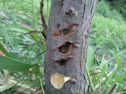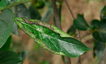 - 새 가지에는 5월경에 나타나기 시작하며, 증상은 작은 흑색 반점이 생기다가 커지다가 타원형 암갈색 병반을 생성한다.