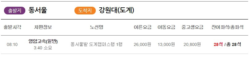 대학교에 합격해서 입학하는 것도 포함하고 있을 것 같아서 조사해 보았다. 강원대 도계캠퍼스 가는 방법에 대해 알아보니, 서울에서도 직행하는 시외버스가 있다. 동서울시외버스터미널에서 출발하여 강원대 도계캠퍼스까지 직행하는 버스가 있는데, 버스비는 26,000원이며 약 3시간 40분이 소요된다고 한다. 아침에 출발하면 점심시간 즈음에는 도착하는 듯하다.
