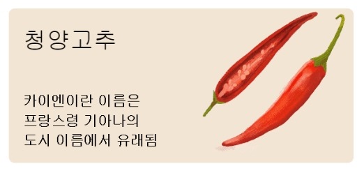 청양고추의 영어 이름은 카이엔인데 프랑스령 기아나의 도시 이름에서 유래되었다고 한다.