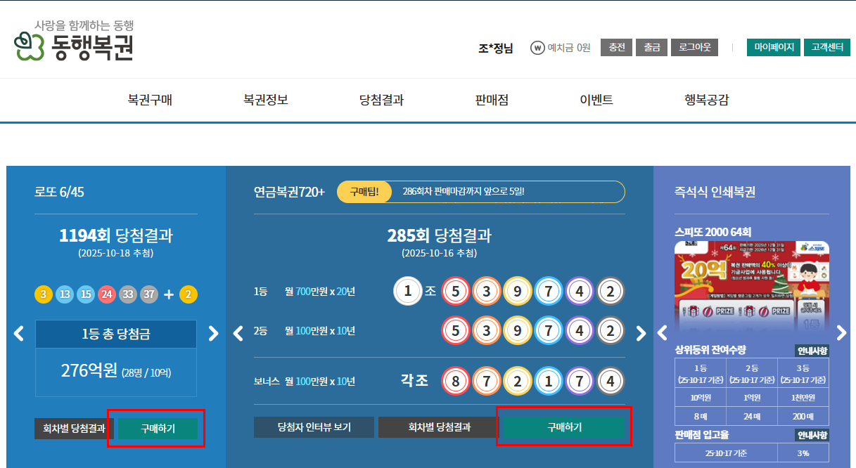 - 예치금 결제: 예치금 계좌에 미리 충전 후 복권 구매 (충전 단위: 최소 1천원)