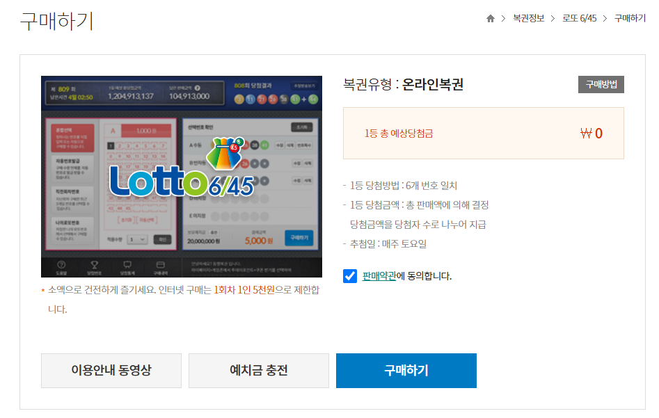 - 예치금 결제: 예치금 계좌에 미리 충전 후 복권 구매 (충전 단위: 최소 1천원)