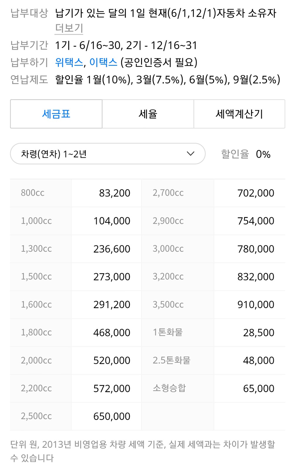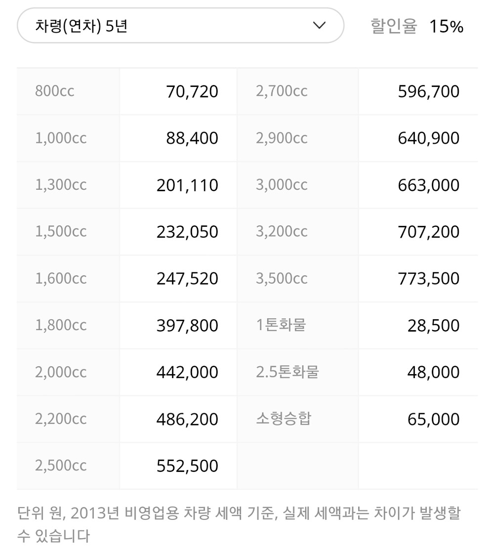 자동차 세금은 배기량에 따라 다르며 차령에 따라 할인율이 적용됩니다.