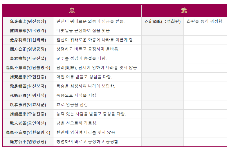 충무라는 시호를 예로 들자면 아래의 충에 해당하는 업적이 있으면 시호에 "충(忠)"을 추증한다.