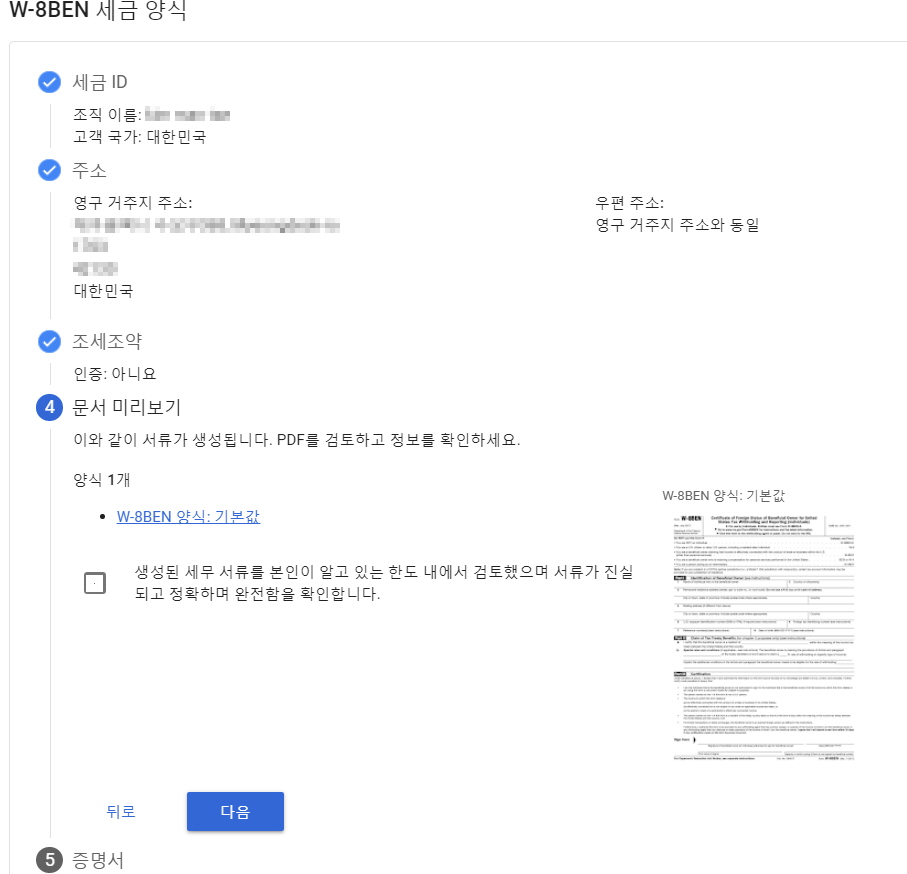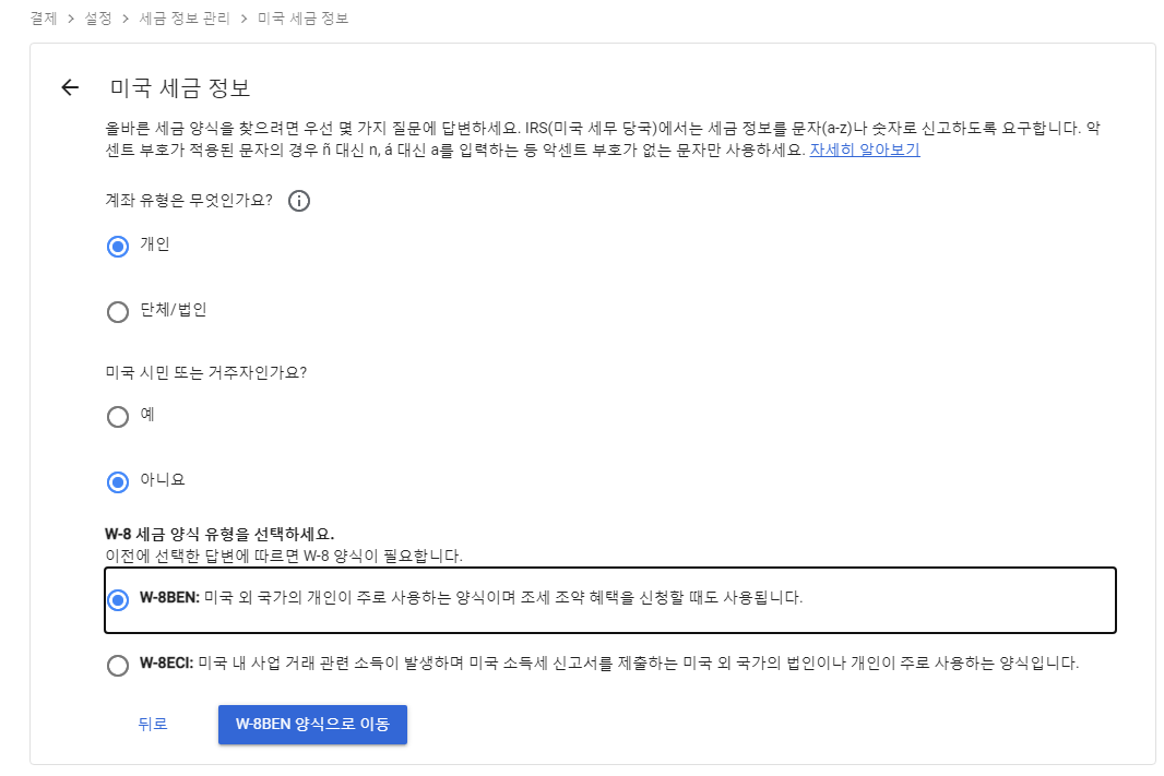 그러면 W-8 BEN 세금 양식을 기입해야 합니다.
