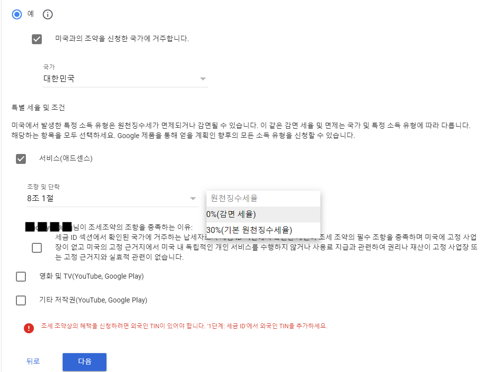 미친척하고 예를 선택했을 때 서비스(애드센스) 감면세율이 0%에 해당하지만... 기본 원천징수 세율은 30%나 됩니다.