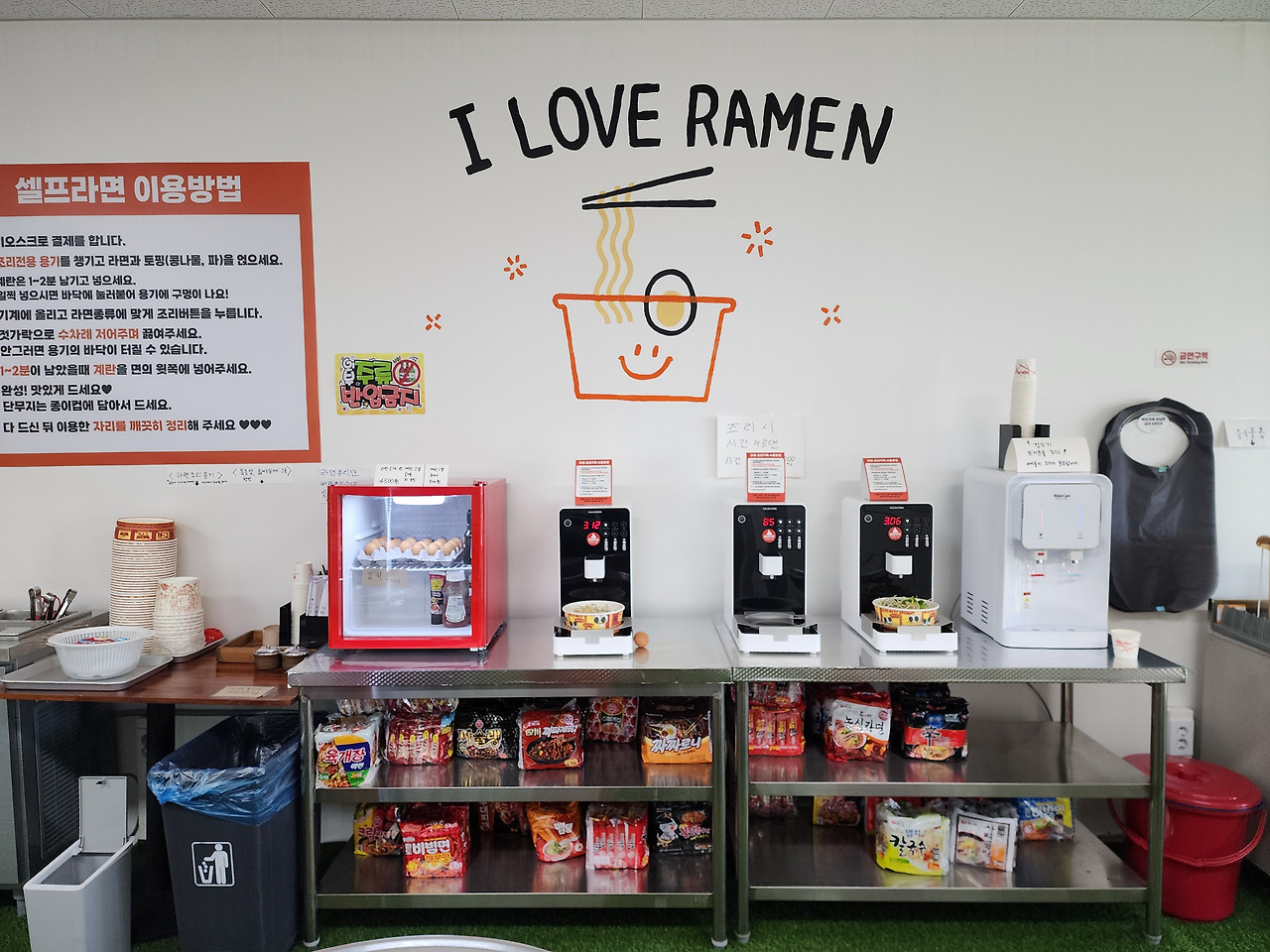 내부 인테리어는 화이트와 오렌지톤이 어우러진 밝은 분위기입니다. 가운데 벽에는 큼지막하게 “I LOVE RAMEN”이라는 글씨와 귀여운 라면 캐릭터가 그려져 있습니다. 깔끔하게 정리된 조리대와 라면 진열대, 그리고 깨끗한 인덕션 표면이 인상적입니다. 바닥은 인조잔디로 꾸며져 있어, 마치 피크닉 온 기분을 주죠.