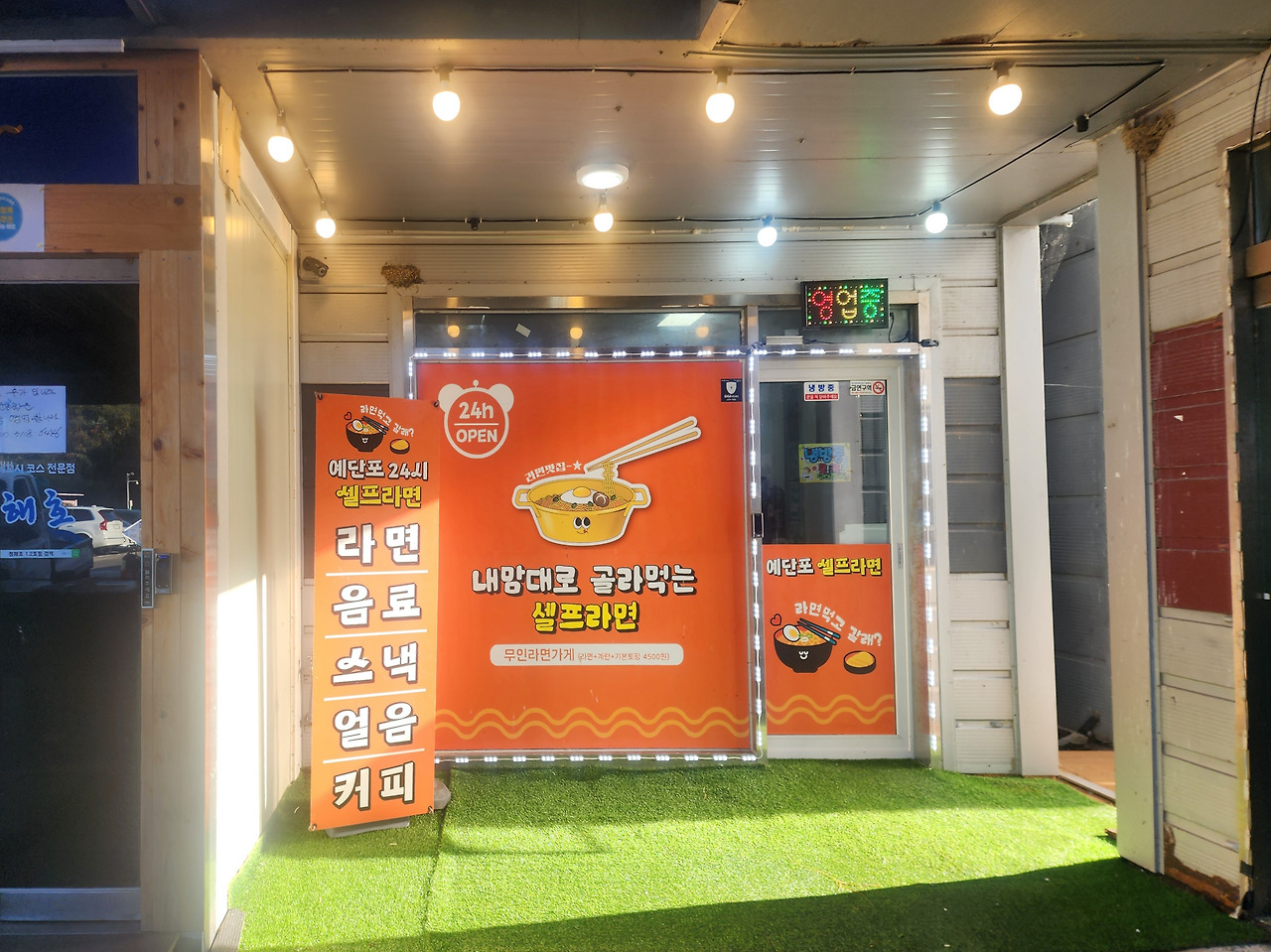예단포 셀프라면은 이름 그대로 24시간 운영됩니다. 언제든 문을 열면 밝은 조명이 켜져 있고, 따뜻한 라면 냄새가 반겨줍니다.
