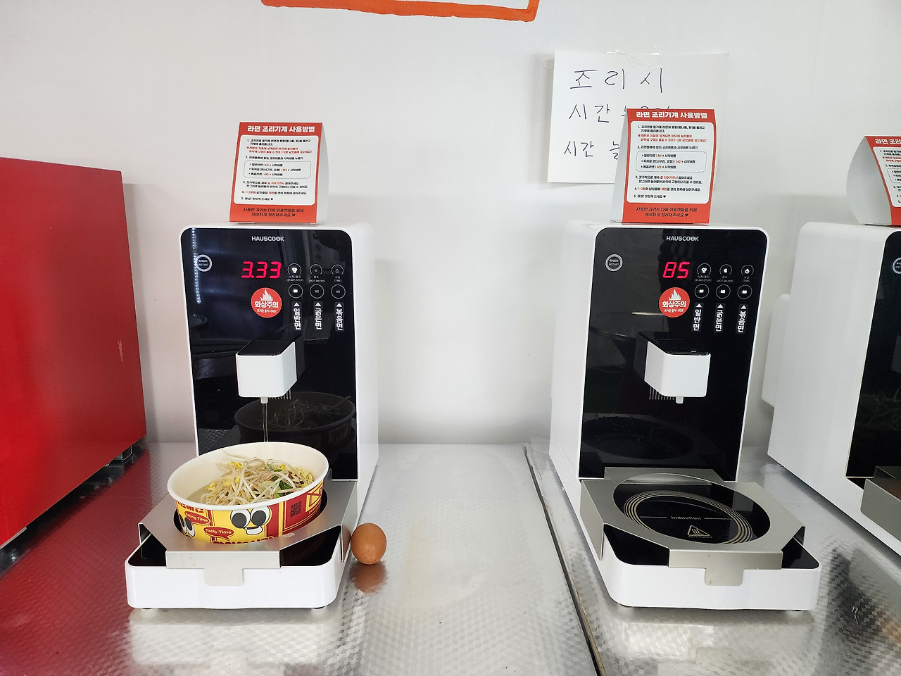 예단포 셀프라면의 핵심은 ‘자동 라면 조리기’입니다. 직접 냄비에 끓이지 않아도, 기계가 정확한 시간과 온도로 라면을 완성해 줍니다. 조리대에는 HAUSCOOK 브랜드의 전자동 라면기가 여러 대 설치되어 있으며, 각각 사용법이 깔끔하게 안내되어 있습니다.