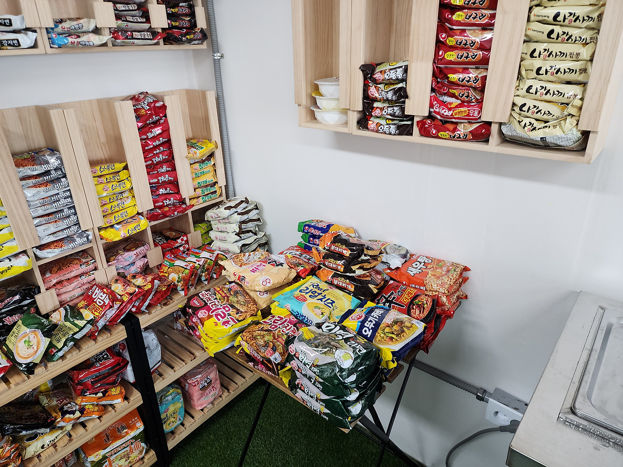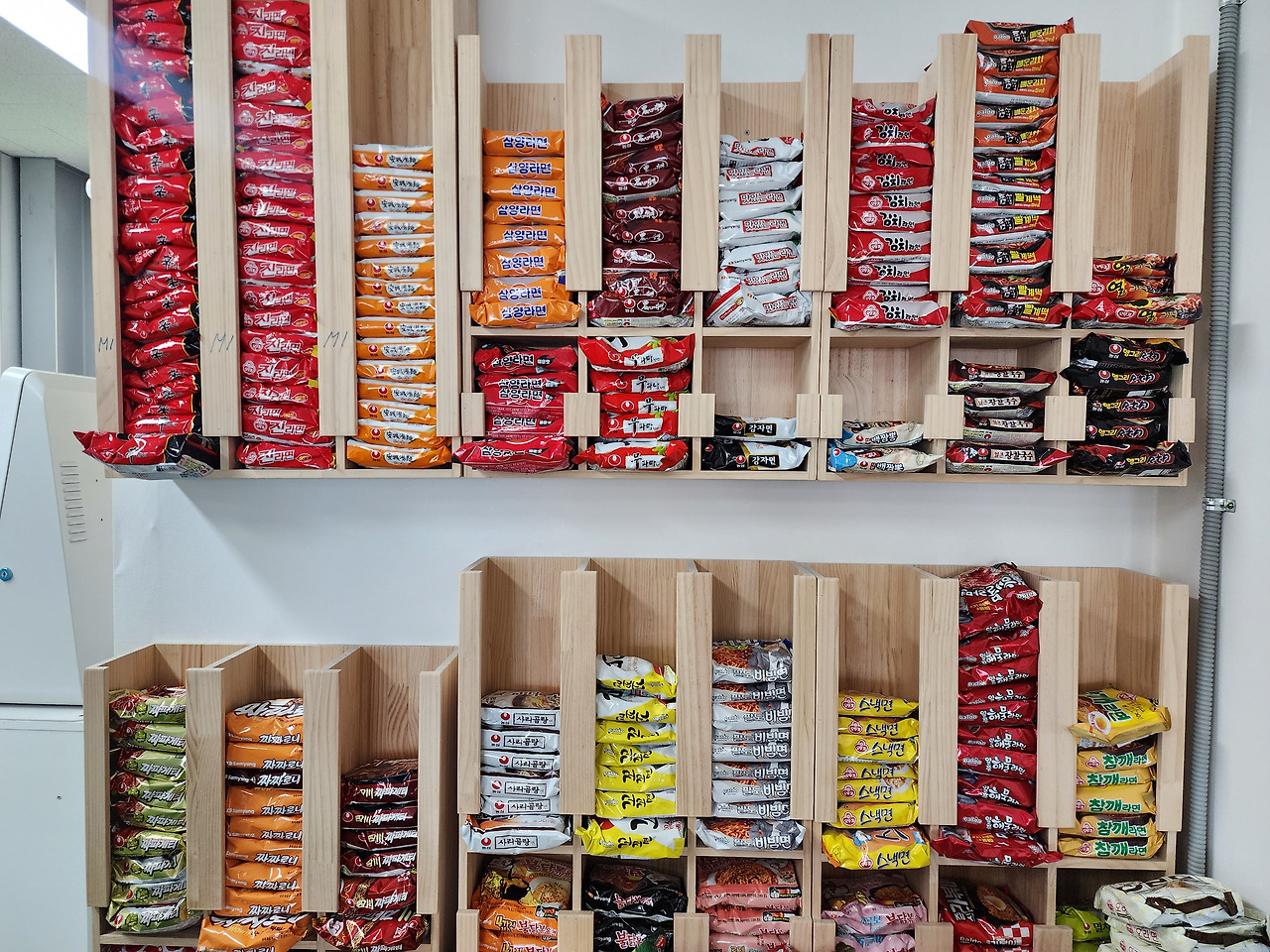 마치 라면 박물관에 온 듯 다양한 브랜드가 한눈에 들어옵니다. 보기 좋게 정렬된 포장지 색감만으로도 눈이 즐겁습니다. 라면 애호가라면 “오늘은 어떤 걸 먹을까” 고민만으로도 행복할 정도죠.