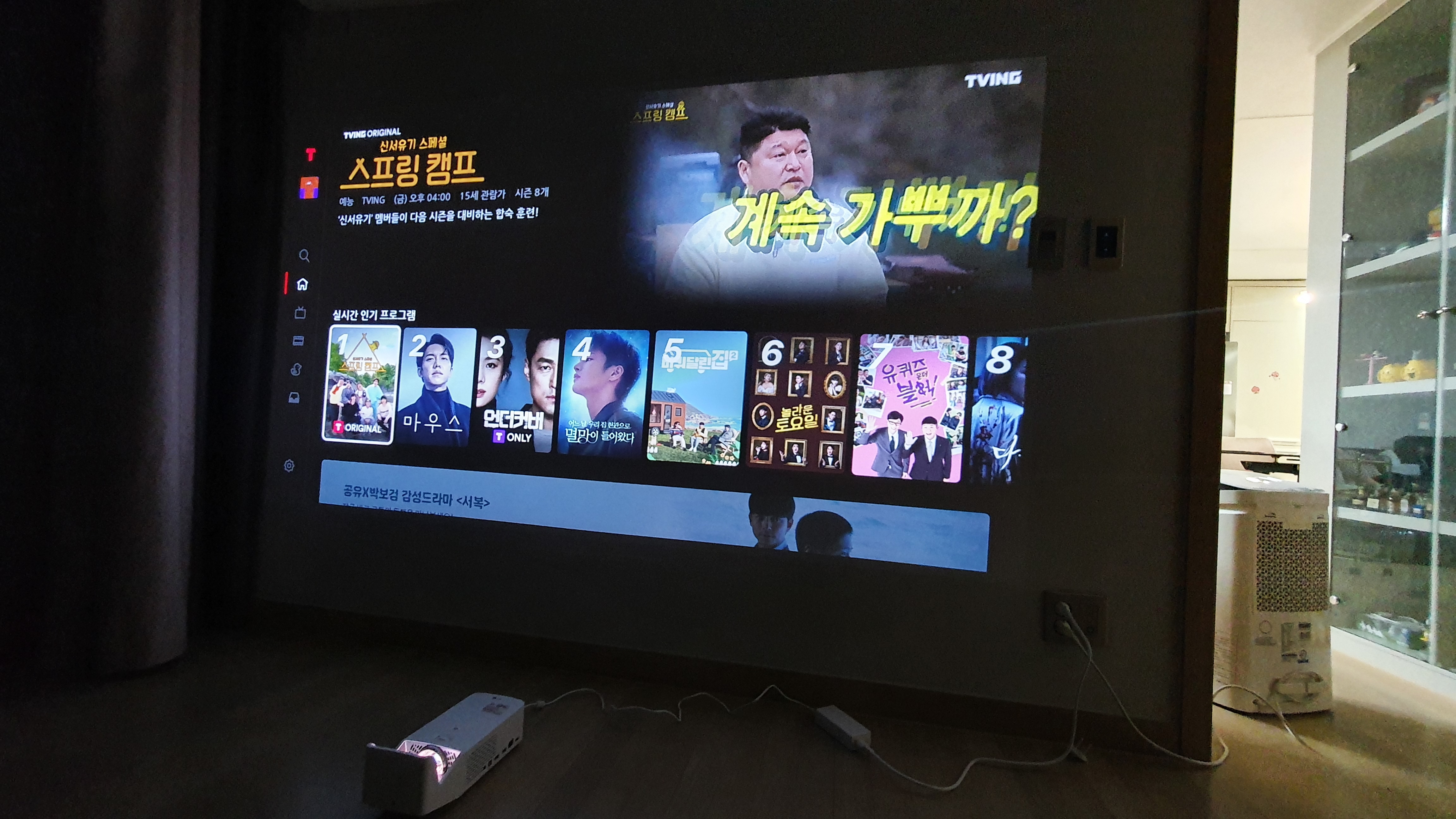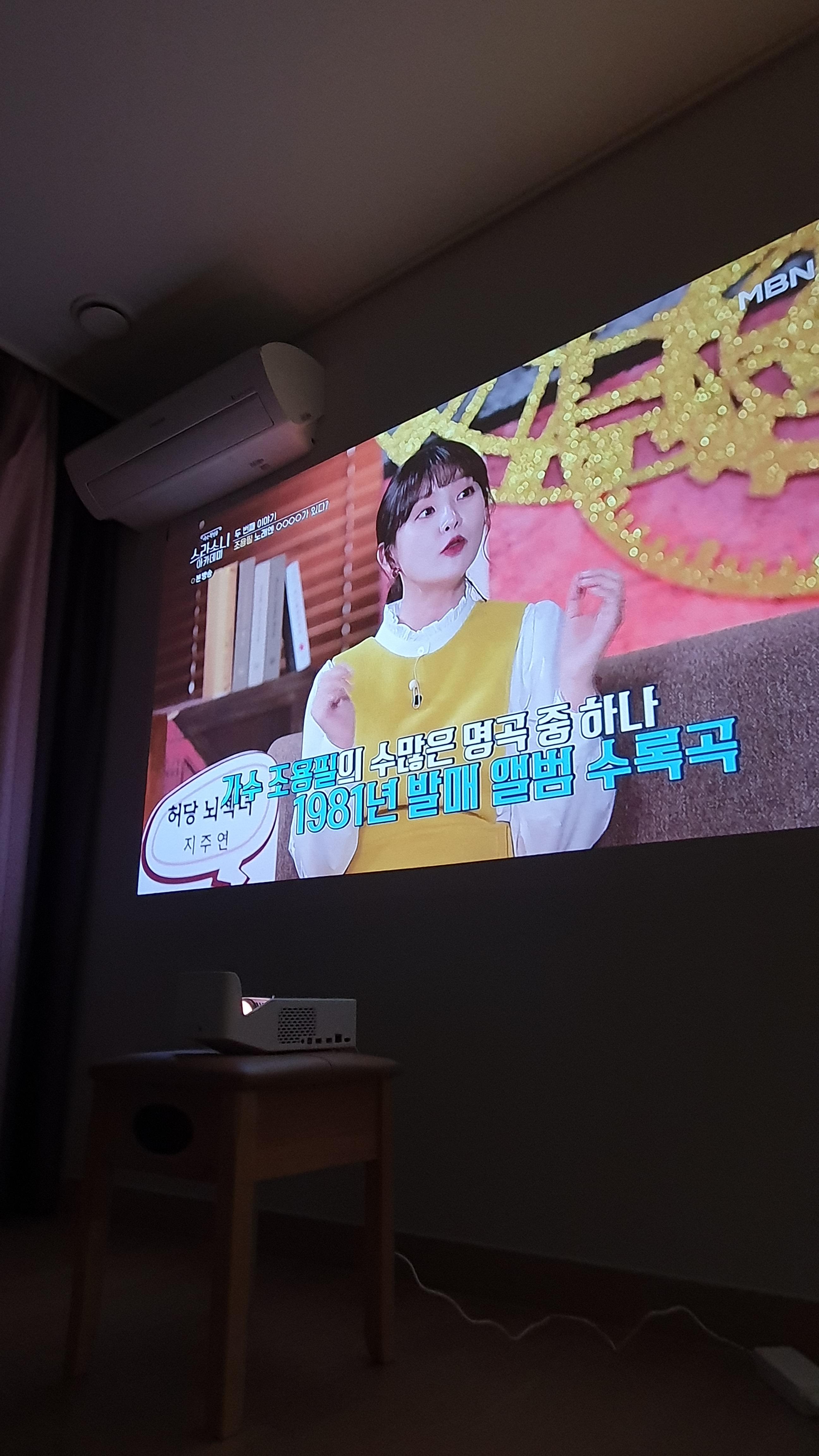 아니 이렇게 좋은 빔프로젝트라면 저렇게 핑핑 남아도는 공간에 적당히 깔끔하고 괜찮은 협탁 하나 사두고 보면 될 것을...