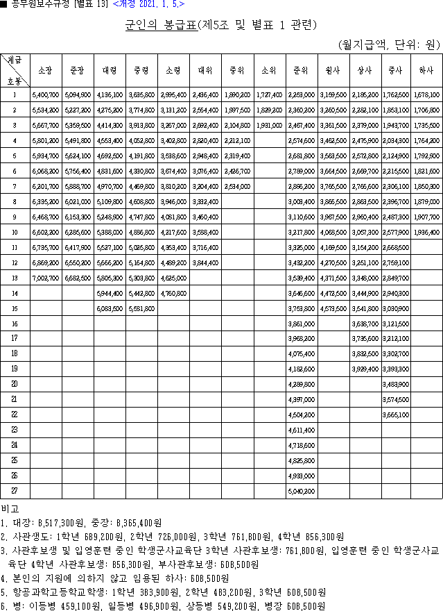 인사혁신처 2021년 공무원 봉급표 및 교사 호봉표, 군인 월급