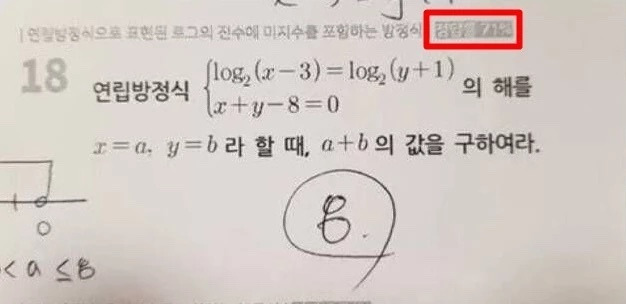 로그가 어쩌고 저쩌고...에서 넋을 놓으면 29%에 들어간다. 마찬가지로 a-b의 답도 구할 수 있고 이를 통해서 a, b도 다 구할 수 있지만 문제는 관대하게도 a, b 합의 값을 구하란다. 이 문제 보자마자 답을 내지 못하면 그냥 죽어라. 그런 의지도 없고 뇌도 없는 유전자를 세상에 퍼트려서 뭐 할래? 인류에게 민폐 끼치지 말고 그냥 하직하셔. 설명을 해도 모를 뇌니까 설명 듣지 말고 혀 깨물어라.