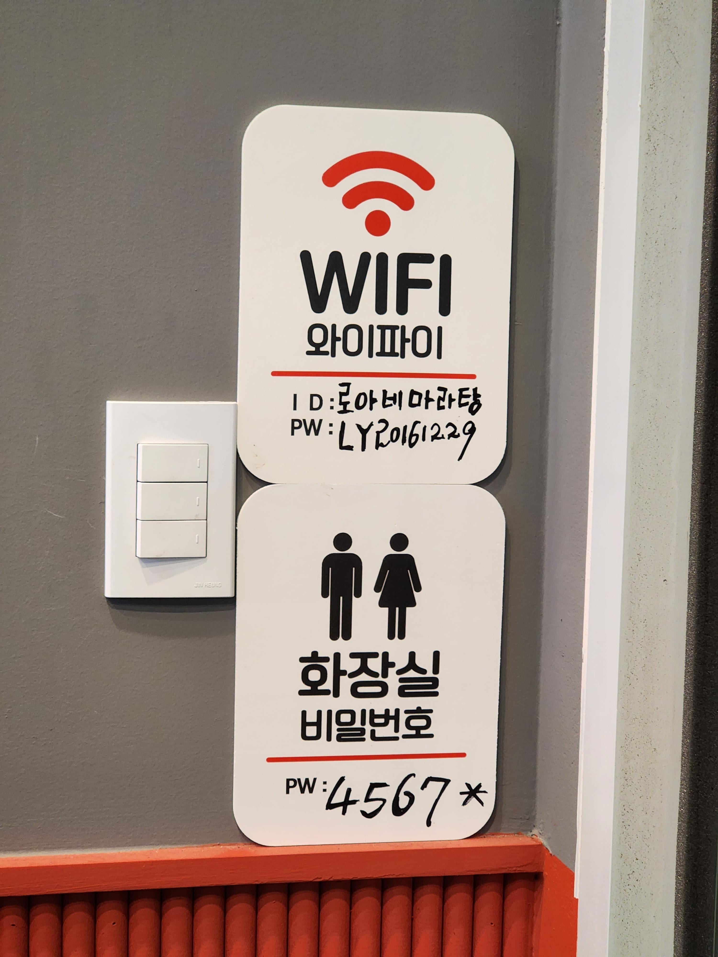 방문객들의 편의를 위해 로아네 마라탕은 무료 와이파이를 제공합니다. 와이파이 ID는 "로아네 마라탕"이며, 비밀번호는 'LY20161229'입니다. 또한, 화장실 이용을 위한 비밀번호는 '4567'로, 주변에 급한 분들도 편하게 이용할 수 있습니다.