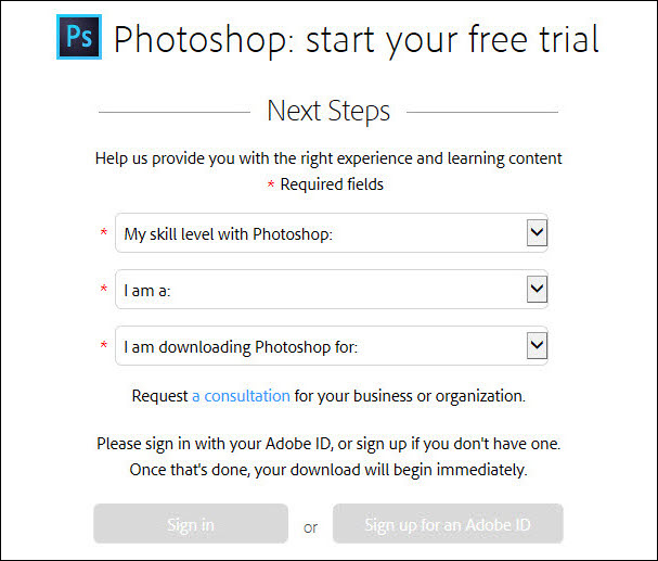 몇가지 질문이 나오네요. 포토샵 실력이 어느정도냐 등등 간단하게 체크하고 Sign in 클릭. - 설치: 로그인 후 포토샵 CS6 체험판을 다운로드하고 설치합니다.