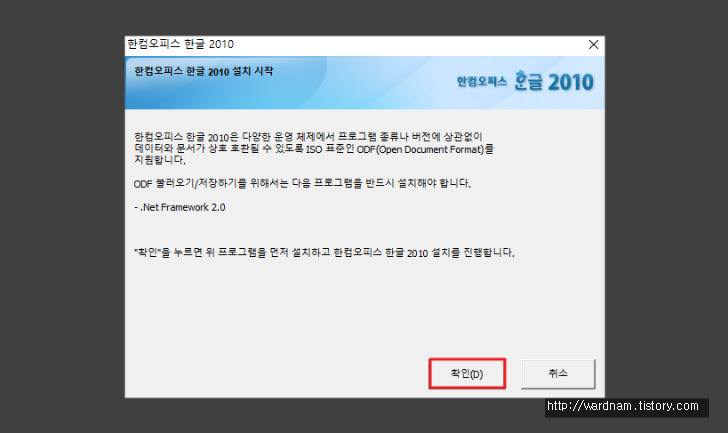3. 한컴오피스는 다양한 운영체제에서 프로그램 종류나 버전에 관계없이 상호 호환될수 있디록 ISO 표준인 ODF를 지원합니다. 고로 설치전 ODF 불러오기/저장하기를 사용하기 위해 컴퓨터에 'Net Framwork'를 선행 설치해야 합니다. 위와 같은 화면이 나오면 아래 '확인'을 클릭해 넷프레임워크 2.0을 먼저 설치해 주세요.