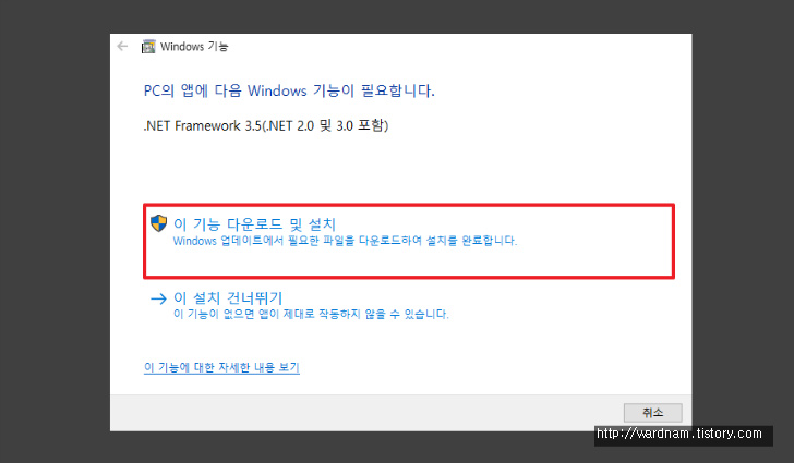 4. PC의 앱에 다음 Windows 기능이 필요합니다 라고 나오면 '이 기능 다운로드 및 설치' 버튼을 클릭해 컴퓨터에 Net 2.0 및 3.0포함된 'Net Framework 3.5' 버전을 설치합니다.