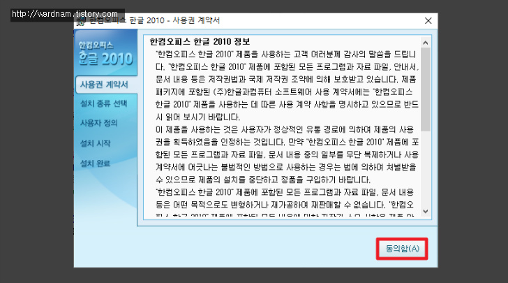 한글2010 라이선스 계약서 동의함