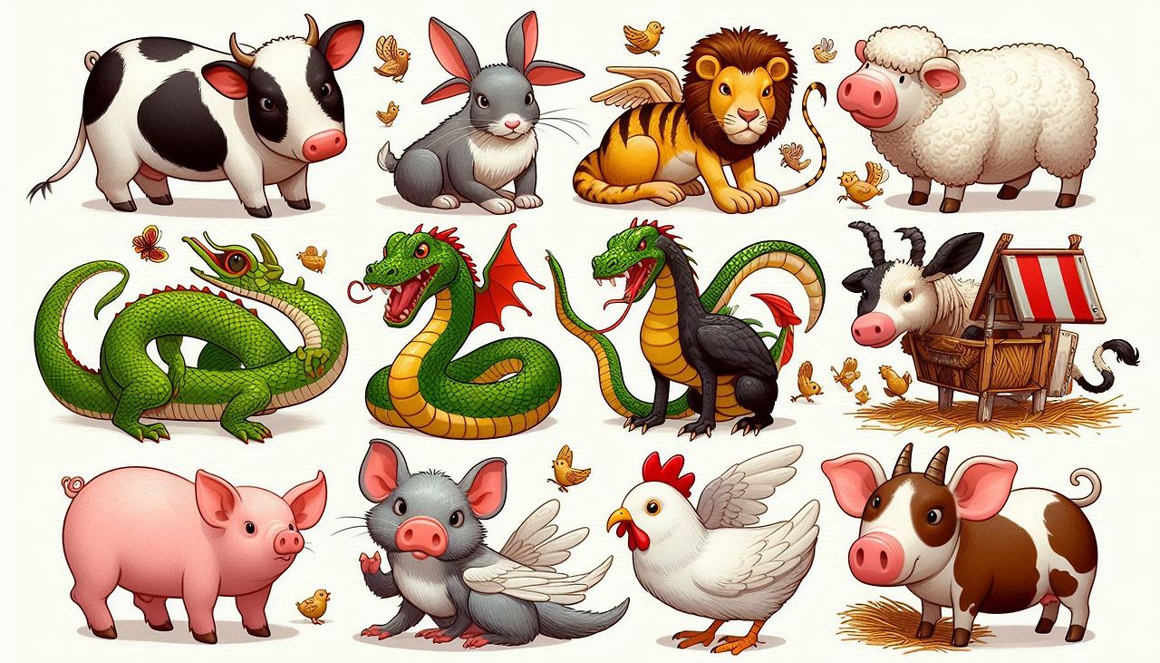 - 동일: 쥐, 소, 호랑이, 토끼, 용, 뱀, 말, 양, 원숭이, 닭, 개, 돼지