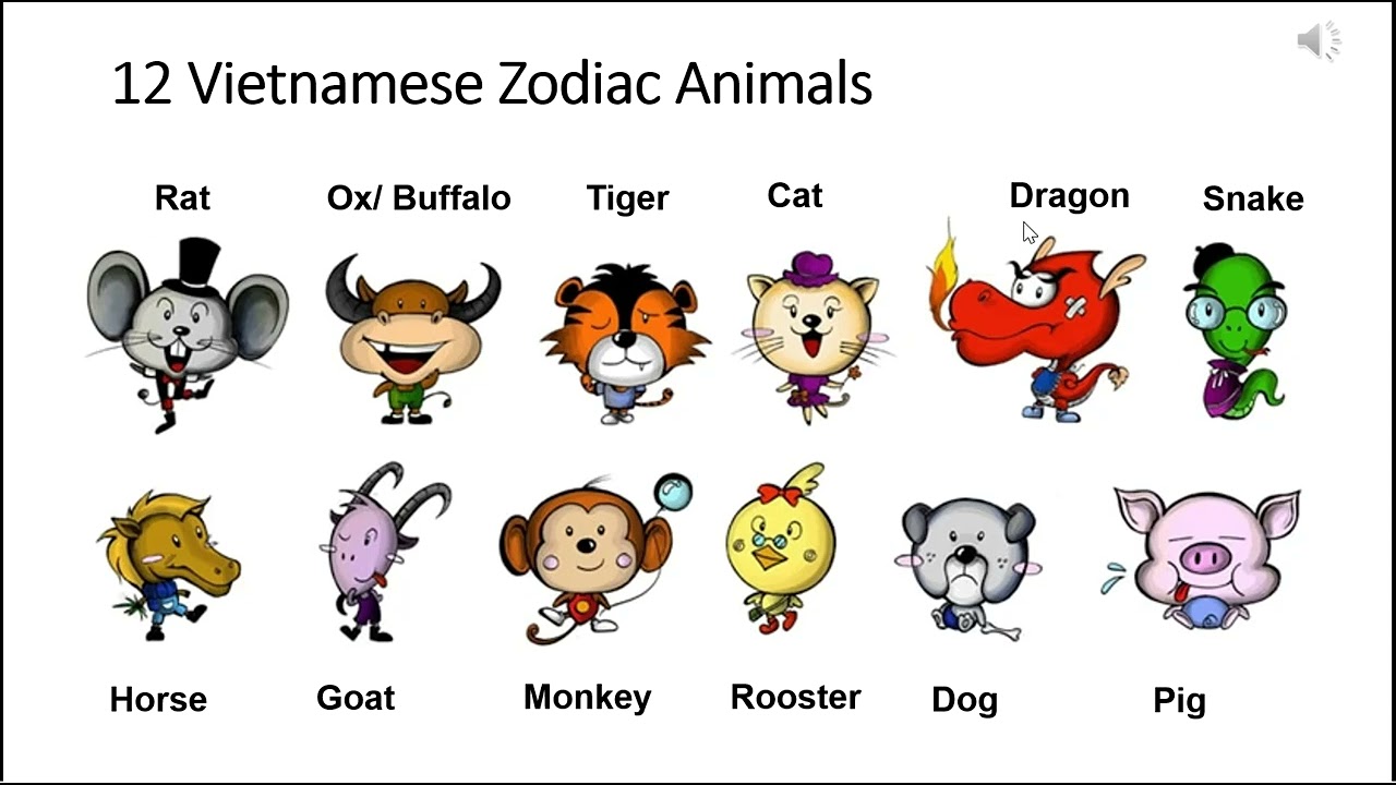 - 쥐, 소, 호랑이, 고양이, 용, 뱀, 말, 양, 원숭이, 닭, 개, 돼지