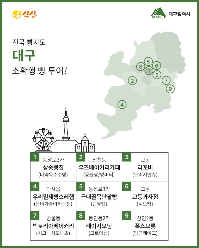 선정된 주요 맛집들을 살펴보면 지역 명물 빵집으로 불리는 서울의 '태극당'과 '나폴레옹과자점', 인천의 '안스베이커리', 부산의 '옵스'와 '백구당제과점', 대전의 '성심당', 대구의 '삼송빵집', 광주의 '궁전제괴', 울산 '파란풍차'가 각각 이름을 올렸습니다. 또한 서울의 '꼼다비뛰드'와 '어글리베이커리', 부산의 '베이커스', 대구의 '양인제과'와 '레이지모닝'은 모두 7,000건이 훨씬 넘는 인스타그램 태그 수를 기록하는 등 SNS에서 인기를 끌고 있는 매장들입니다.
