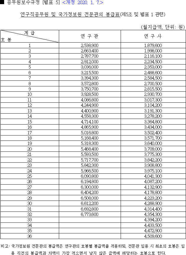 2020년 공무원 봉급표 2020 교원 호봉표 연구직 지도직 공안직 공무원 판사 검사 월급표 대통령 연봉