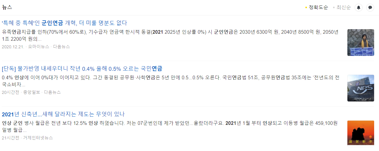 군인연금은 최근 몇 년 동안 국민연금 인상률에 준해서 인상되고 있습니다. 2021년 군인연금 인상률 또한 0.5%로 결정되었습니다.