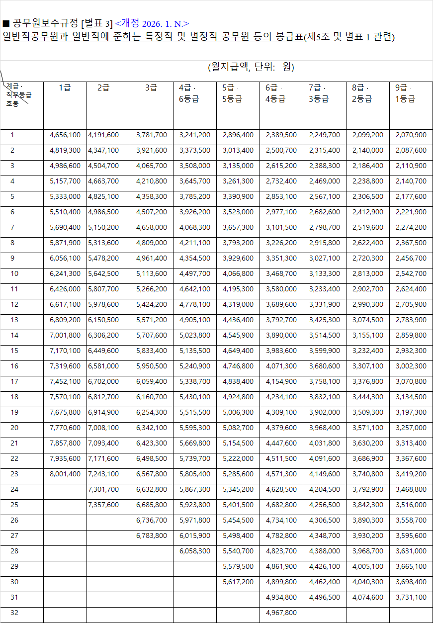 - 2026년 일반직렬 공무원 봉급표