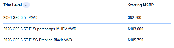 먼저 시장 공개된 해외 기준 2026 제네시스 G90 가격을 토대로 트림별 2026 제네시스 G90 가격표를 살펴봅니다. 국내 정식 발표 전이므로 환율, 세금, 옵션 등에 따라 차이가 있을 수 있다는 점을 미리 염두에 두셔야 합니다.