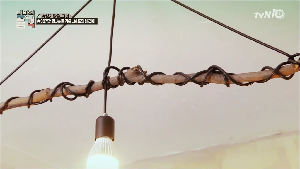 방스타가 산에서 주워온 나무에 직접 전선을 감아 만들었다는 조명.