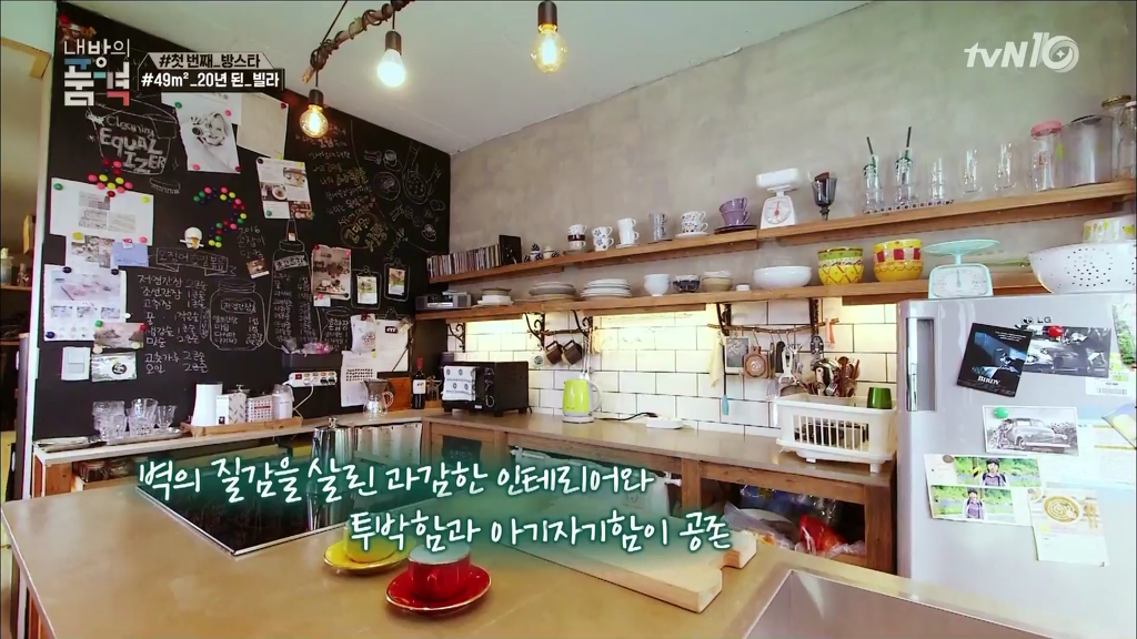 벽의 질감을 살린 과감한 싱글녀 인테리어와 투박함과 아기자기함이 공존.