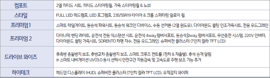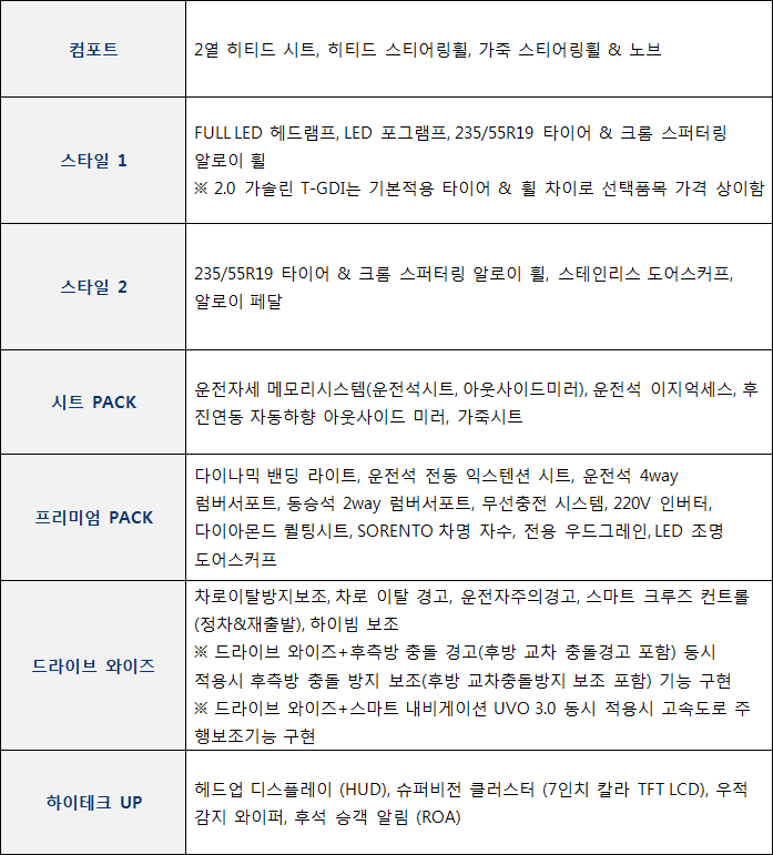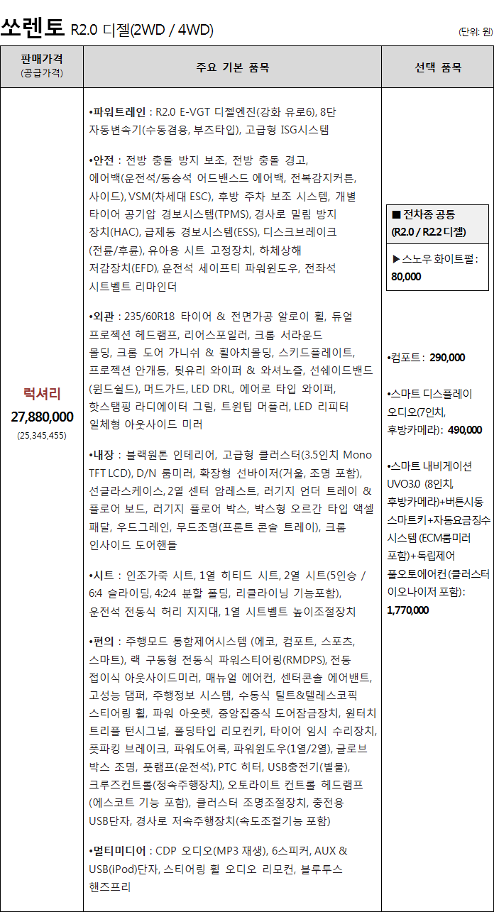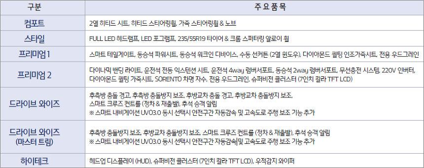 ■ 쏘렌토 디젤 R2.2, 가솔린 선택품목 세부(상세)