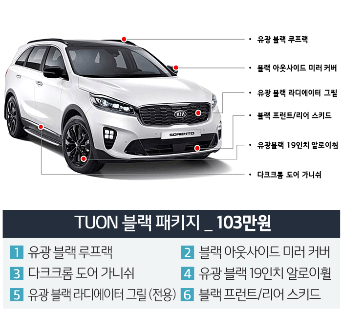 쏘렌토 튜온 블랙 패키지 가격은 103만 원이며, 유광 블랙 루프랙과 블랙 아웃사이드 미러 커버, 다크 크롬 도어 가니쉬, 유광 블랙 19인치 알로이 휠, 유광 블랙 라디에이터 그릴, 블랙 프런트/리어 스키드 등의 항목들로 구성.