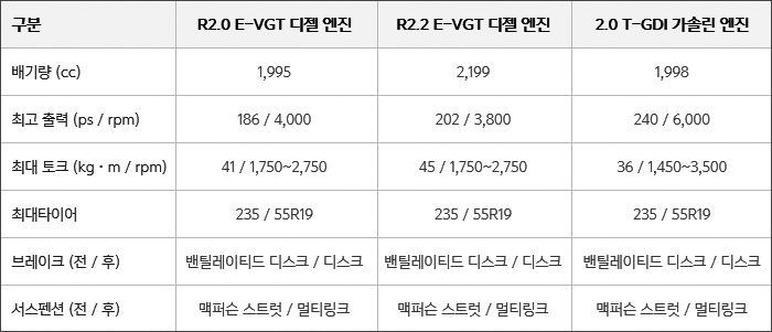 파워트레인 : R 2.0 E-VGT 디젤 엔진 (강화 유로 6), 8단 자동변속기(수동겸용, 부츠타입), 고급형 ISG 시스템