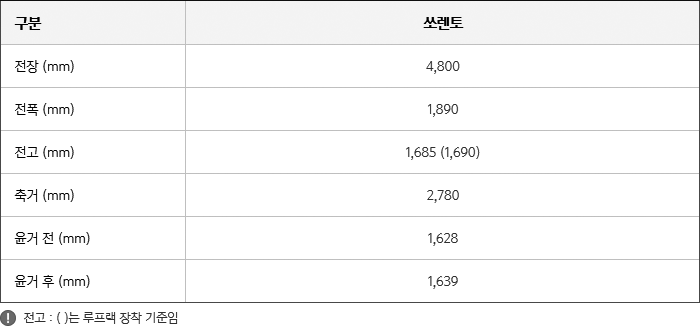 또한 쏘렌토 휠베이스(축거)는 2780mm이며 윤거 전 1628mm, 윤거 후 1639mm다.