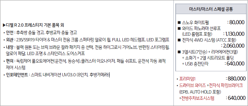 디젤 R2.0 E-VGT : 럭셔리, 프레스티지, 노블레스, 마스터, 마스터 스페셜