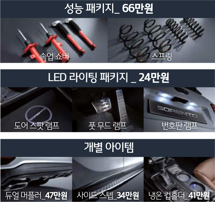 쏘렌토 사이드 스텝 37만 원, 냉온 컵홀더가 41만 원.