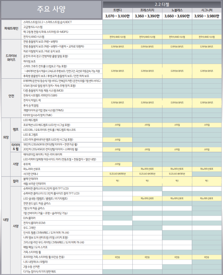 2.2 디젤 모델은 트렌디, 프레스티지, 노블레스, 시그니쳐의 총 4가지 트림이 존재하며 가격은 카탈로그와 같다.