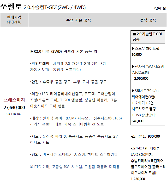 쏘렌토 가솔린 프레스티지 가격은 27,630,000원이다.