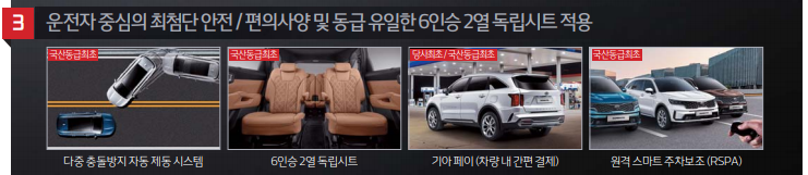 대형 SUV에만 적용되던 2열 독립 시트를 적용하였고 또한 3 열시트의 각도를 조절할 수 있어 고객들의 호평이 이어지고 있다.