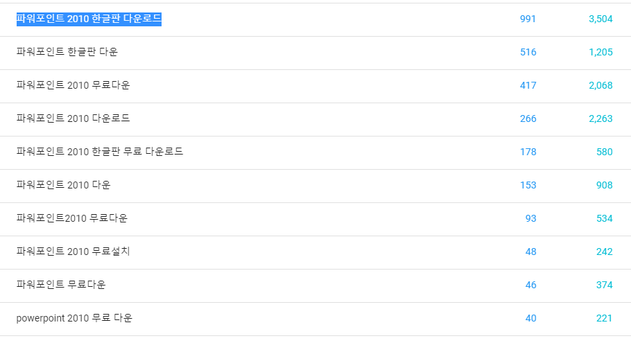 2019년 11월15일 파워포인트 2010 한글판 다운로드 클릭 실적